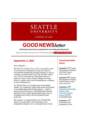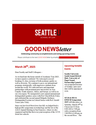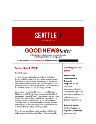 Published by the Seattle University School of Law Dean's Office, the GOOD NEWSletter highlights recent community accomplishments and notable events.